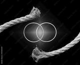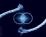 Between frayed and broken rope, two silver rings are joined and glowing with unity