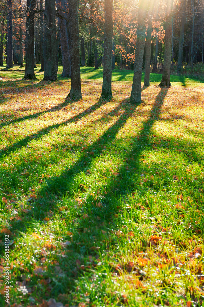 Peaceful woodland scene with autumn tones and sunlight streams through trees