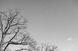 Minimalist autumn scene captures seasonal stillness with bare tree branches against a clear blue sky