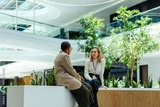 Two female colleagues enjoying a lunch break in a modern office