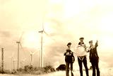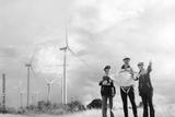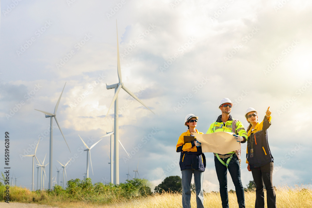 Male and female engineers team walk together wind farm standing tall against cloudy sky sharing ideas about renewable energy from the earth reviewing plans and collecting data on completed mission.
