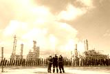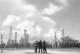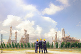 Back view Male engineers walk into the area, inspect safety work area of the refinery separate gas and petroleum chemicals hold a workshop and prevent safety in the outer refinery area : Copy Space