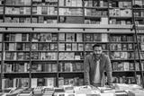 Man in jacket standing in book shop with books on shelves