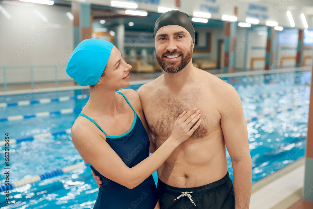 Young cute couple in swimwear in the swimming pool looking happy