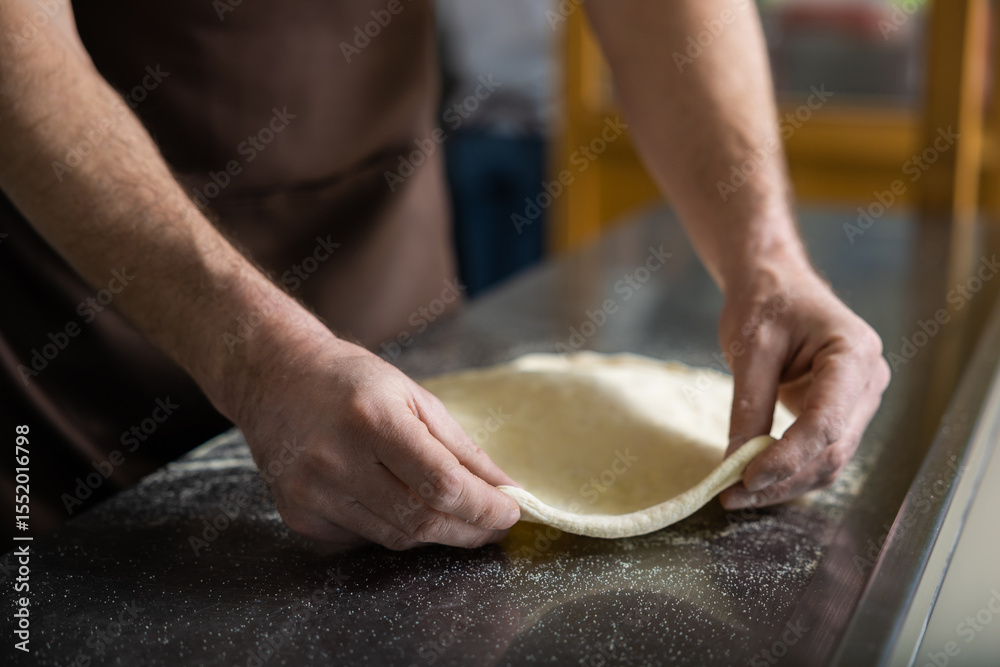 Close up picture of cooker working with dough for pizza