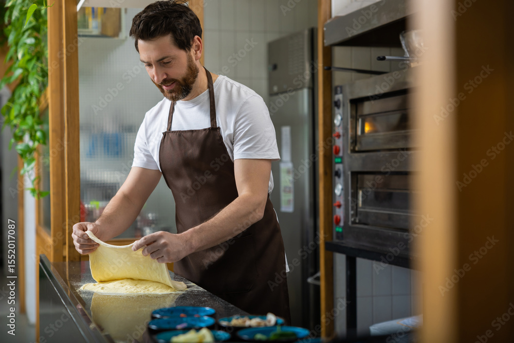 Man working in a pizzeria kitchen and preparing dough for pizza