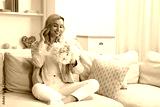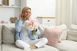 Happy woman with bouquet of beautiful peonies on sofa at home