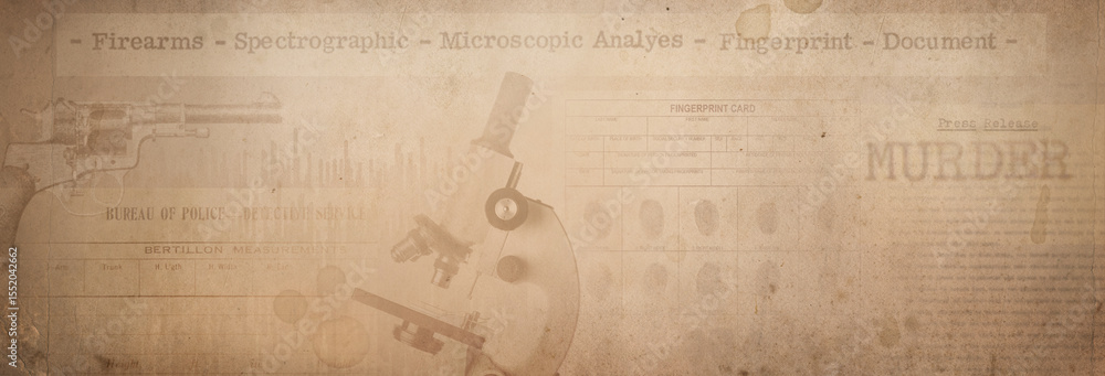 Newspaper clippings of crime news, police fingerprint are placed on a vintage background. Retro background on the theme of crime, police, detective, investigation.