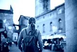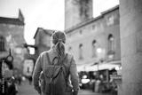 Solo traveler exploring Bergamo streets at sunset during vacation in Italy. Evening at Piazza Vecchia city square in Citta Alta, Bergamo, Italy