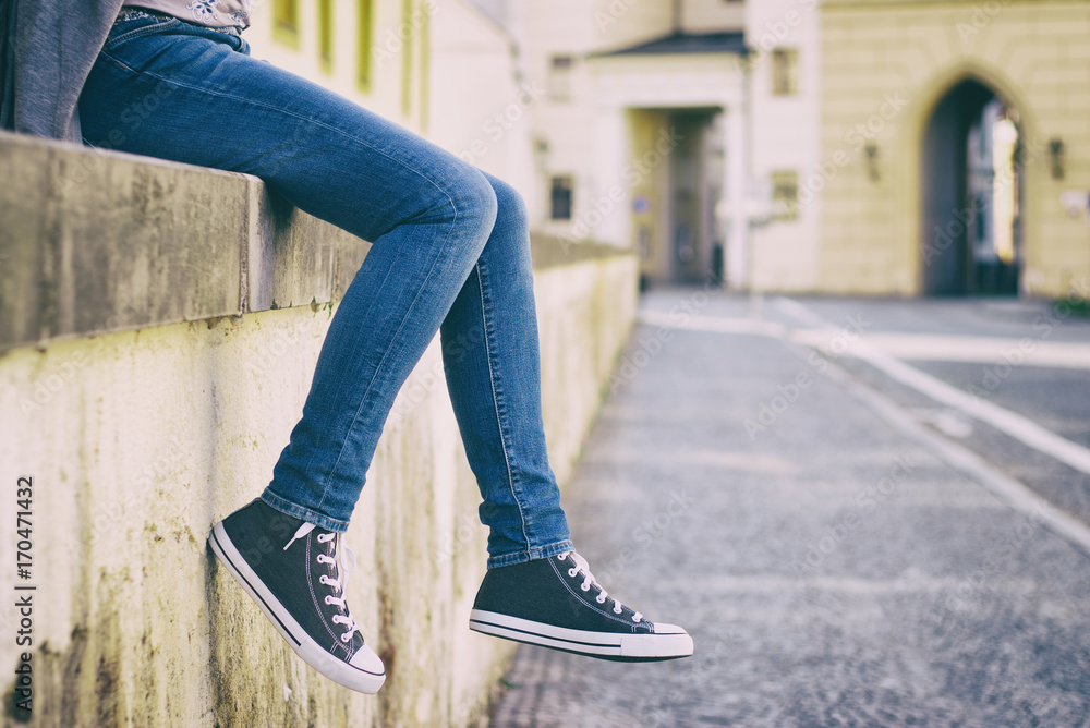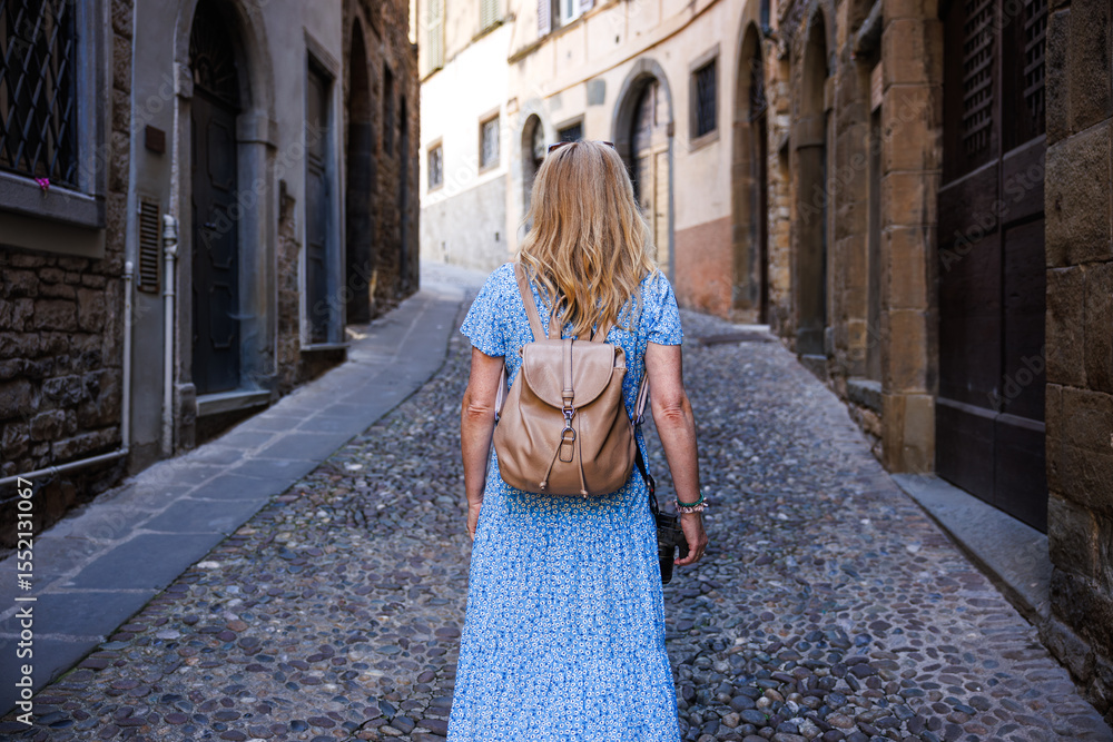 Woman tourist sitting on Venetian Walls above lower town Bergamo, Italy and enjoying view from Citta Alta. City break in Europe