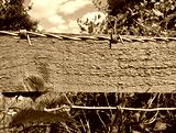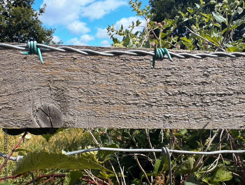 Barbed wire and wooden fence with foliage behind