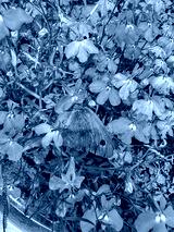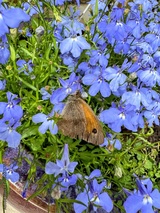 Small heath butterfly on bright blue lobelias