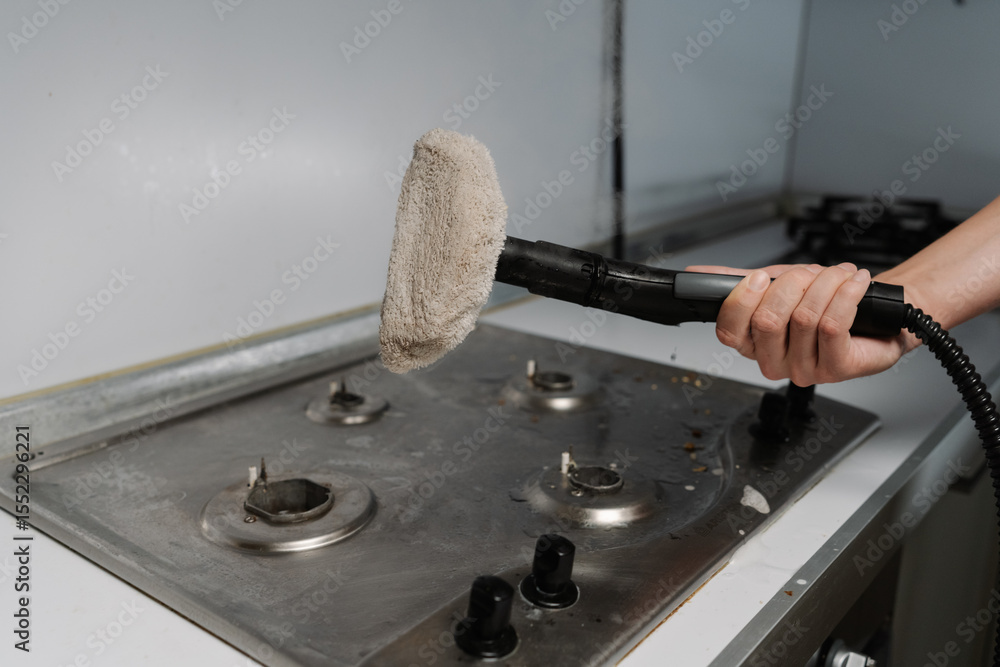 Cropped shot of unrecognizable housekeeper holding steam cleaner with cloth attachment preparing to cleaning dirty gas stove in kitchen, ensuring hygiene and cleanliness, close-up.