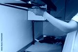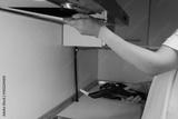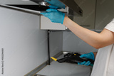 Housekeeper wearing blue gloves removing kitchen hood filter for cleaning with steam cleaner, ensuring thorough maintenance and hygiene in kitchen room. Concept of cleanliness and household.