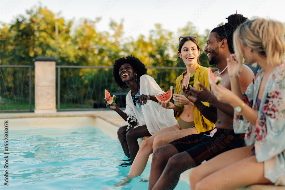Happy friends eating watermelon by the pool during summer holidays