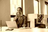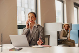 A dedicated professional woman works in a modern office, using her smartphone and laptop to balance tasks effectively