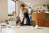 A diverse team collaborating in a contemporary office setting, focusing on productivity and creativity.