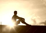 Thoughtful man sitting watching the sunset, self reflection, contemplation in nature alone with your thoughts