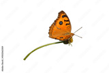 Butterfly with brown wings and black spots on grass flower isolated on white background