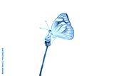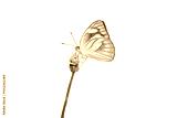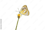 Butterfly with yellow and white wings with brown stripes on grass flower isolated on white background