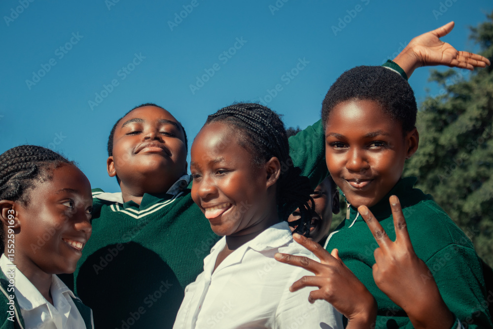 Happy African children in school uniforms enjoying time together outdoors. A genuine moment that reflects joy, education, and the powerful connection between learning.