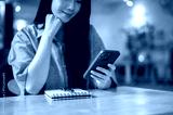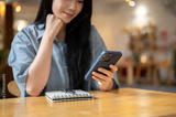 Asian woman resting head on hand watching video texting message on phone with notebook on cafe table