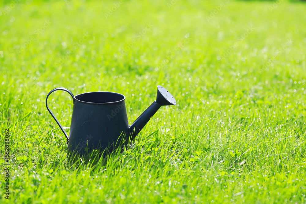 Black Watering Can on Lush Green Grass - Gardening Equipment on Sunny Summer Day