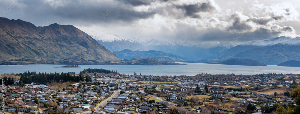Elevated panoramic view of Wanaka, Otago, New Zealand with Lake Wanaka and Southern Alps in background, as seen from Mount Iron peak