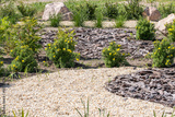 Flower bed with yellow flowers and stones in spring garden. Landscape design.