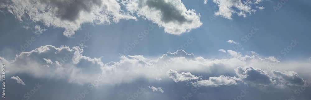 sunny dramatic blue sky with clouds and sunbeams background banner