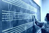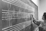 Music teacher writing musical notes on chalkboard during lesson