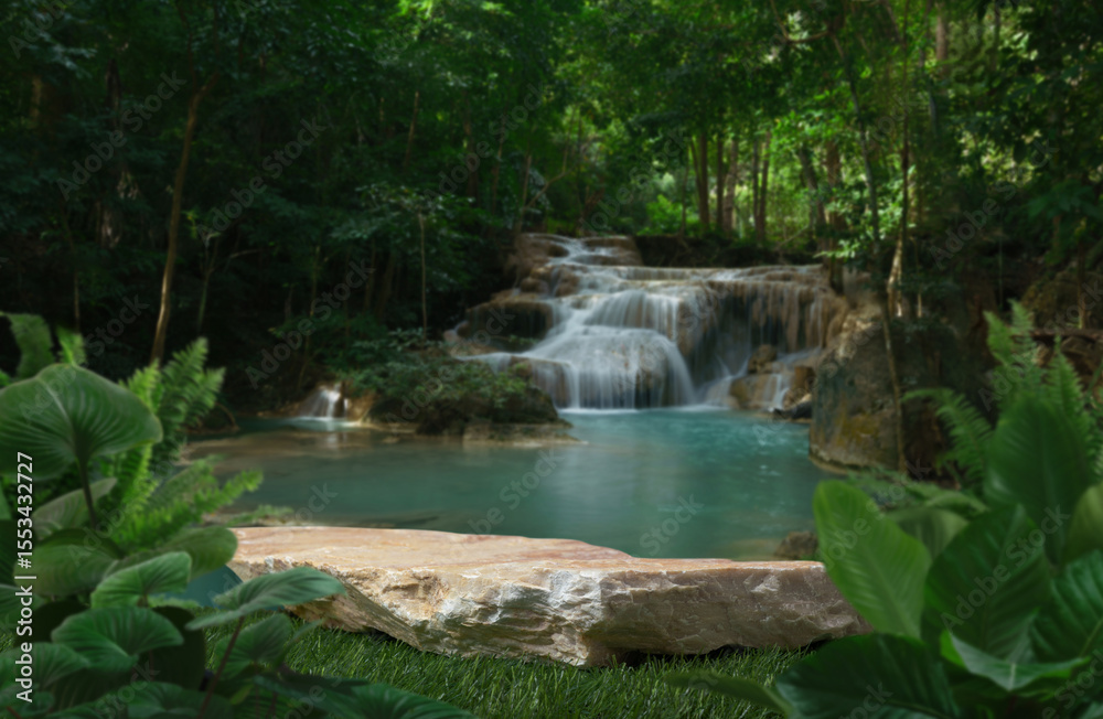 Stone table top podium with outdoor waterfall green tropical forest nature background landscape.Natural water mineral product present placement pedestal rock stand display.jungle paradise concept.