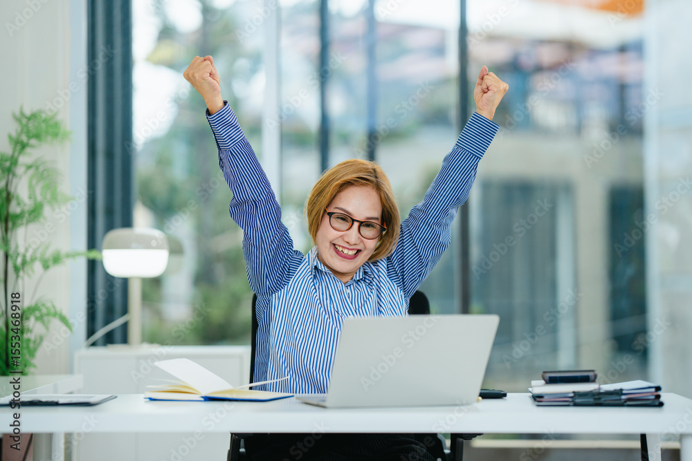 Excited businesswoman reading good news on laptop with confident smile and joyful reaction at modern office