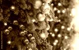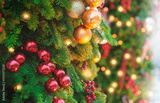 Festive pine tree decoration captured with a bokeh-filled background. Christmas background