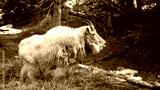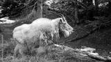 Majestic white mountain goat in a forest clearing. Glacier National Park, Montana, USA.