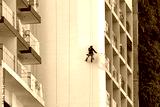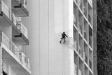 A professional worker with safety equipment paints the tall exterior wall of a modern high-rise building