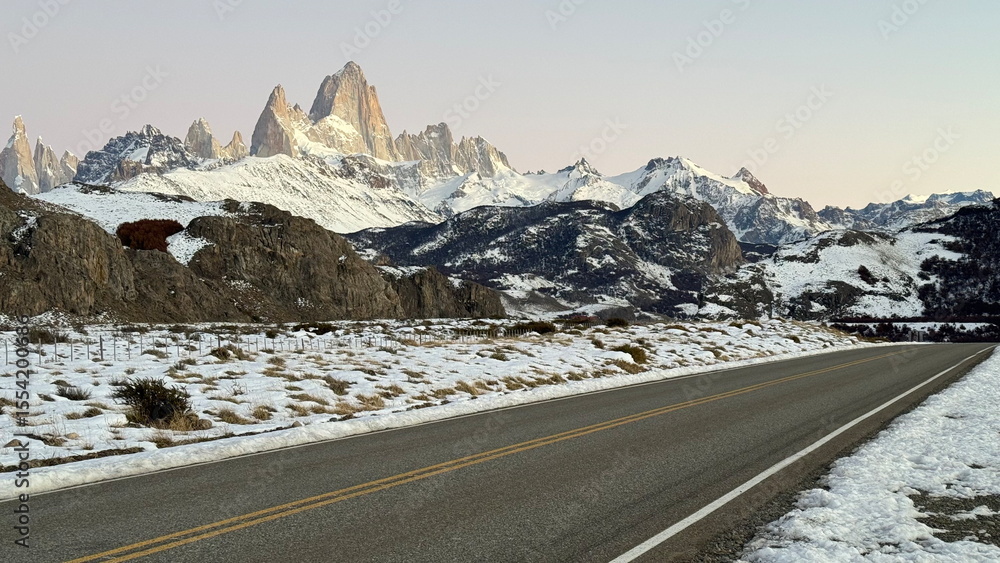 "Road Crossing the Patagonian Townscape with Mount Fitz Roy in the Background"