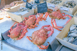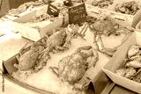 Fresh seafood display featuring crabs and oysters at a market in sunny seaside location