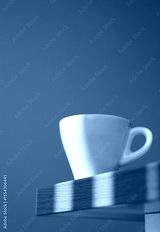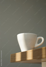 Close up white coffee cup on wooden table under morning window light on clean grey wall background in vertical.