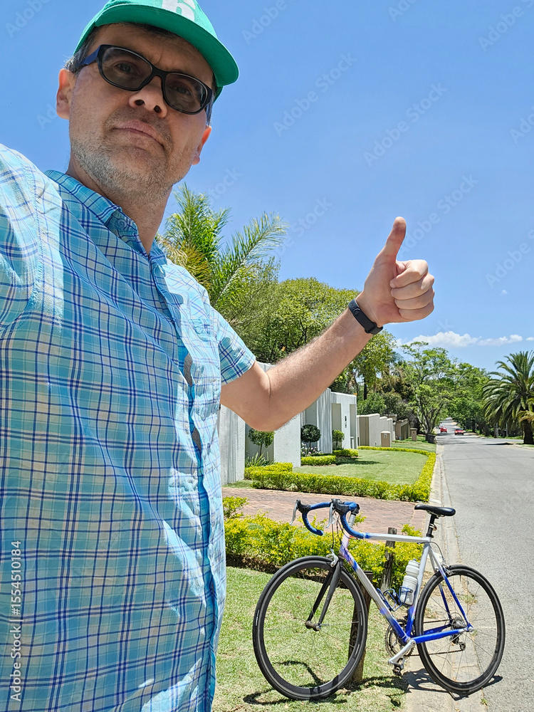 Man wearing a green hat and glasses is standing next to a bicycle. He is giving the thumbs up sign in Johannesburg in South Africa