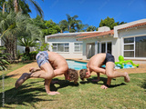 Two men are doing yoga on a grassy lawn. One of them is wearing shorts with a green and white design. father and son in courtyard with pool in Johannesburg in South Africa
