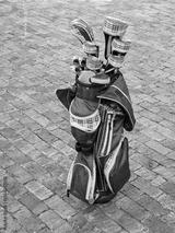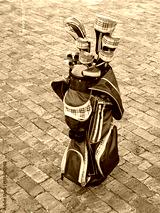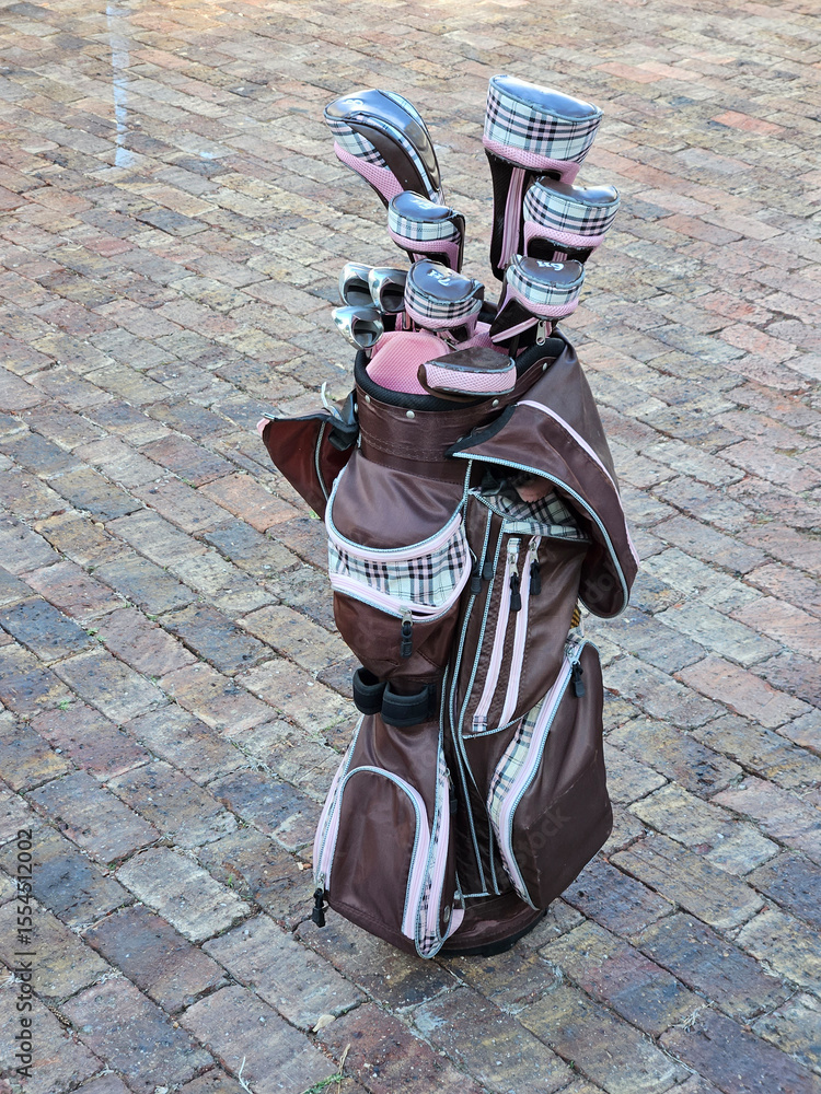 Golf bag with pink and black stripes on it. The bag is brown and has a pink and black pattern