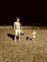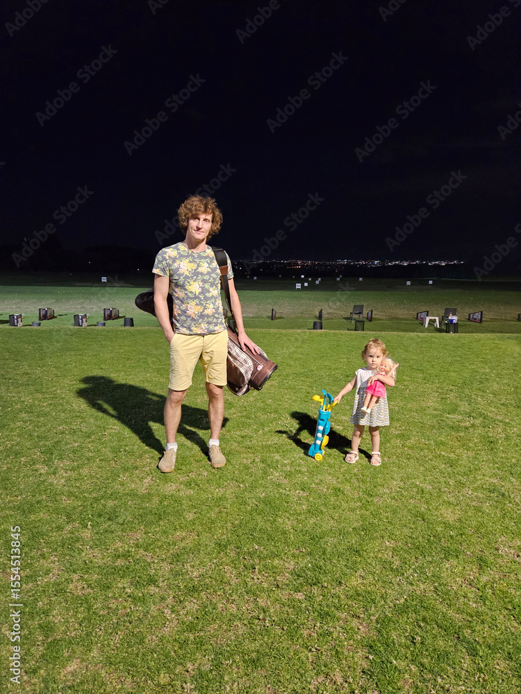Man father and a little girl are standing in a grassy field. The man is holding a golf bag and the girl is holding a toy golf set at night