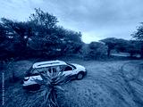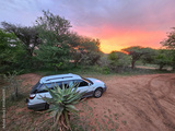 White car is parked in front of a tree. The car is parked on a dirt road during safari in South Africa