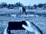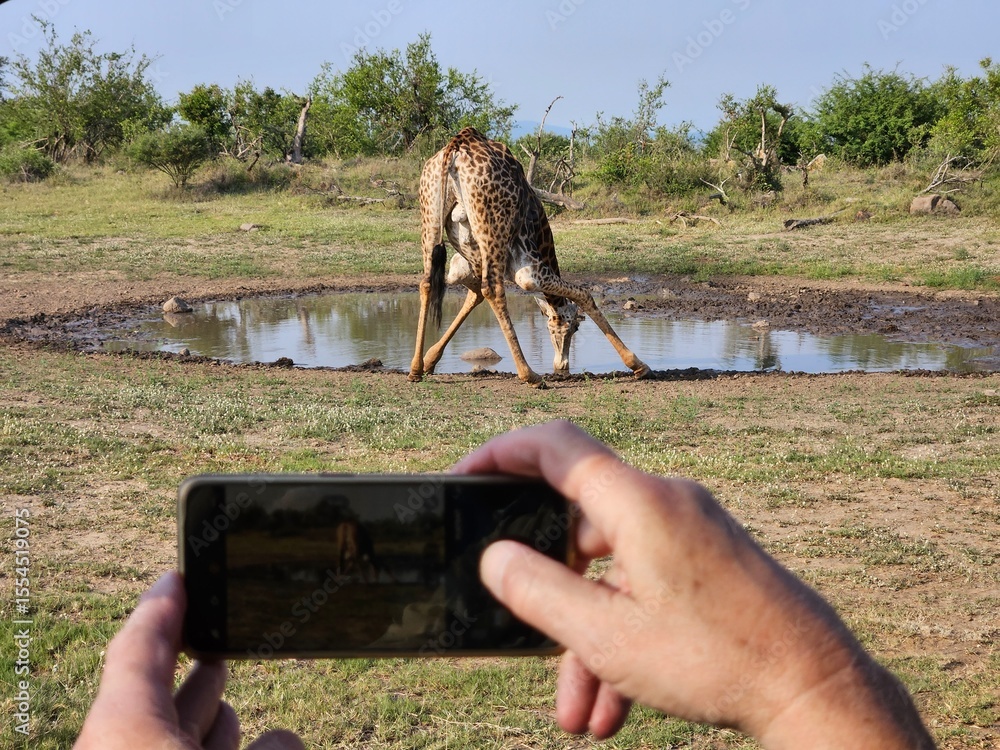 Person is taking a picture of a giraffe drinking water. The giraffe is in the water and the person is holding a cell phone during safari in South Africa