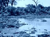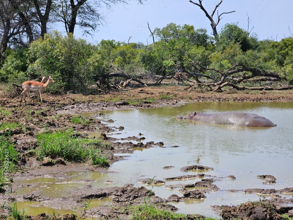 Hippo is in the water next to a muddy pond. A deer antelope is walking in the mud during safari in park in South Africa