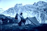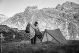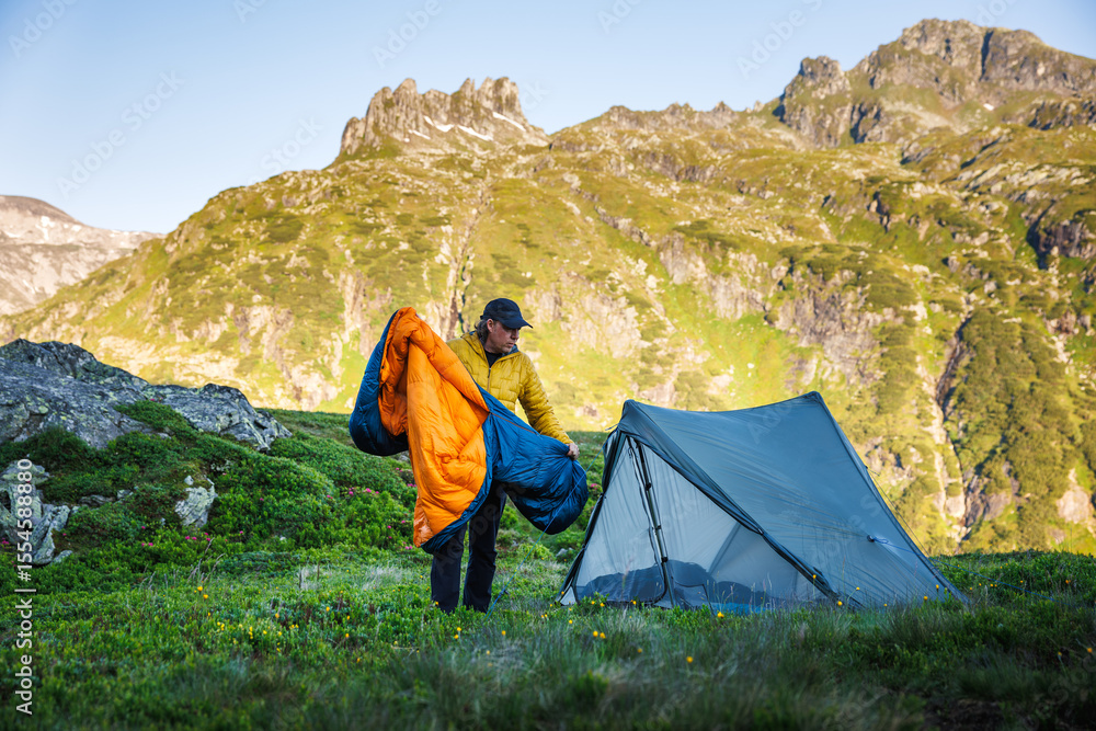 Camping in mountains. Man hiker putting sleeping bag into tent during trekking and mountain hiking