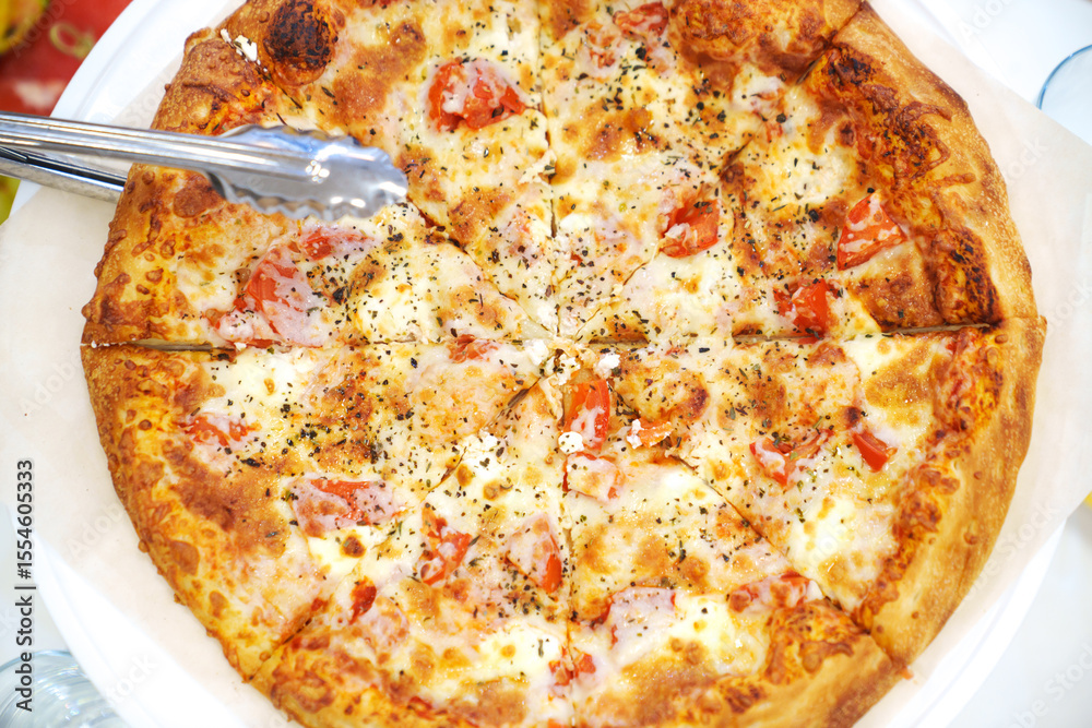 close-up. A large margherita pizza on the table with appetizers for the holiday.