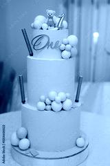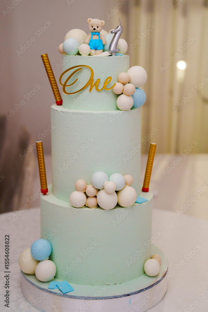 a blue three-tiered cake decorated with bear cub and caramel balls