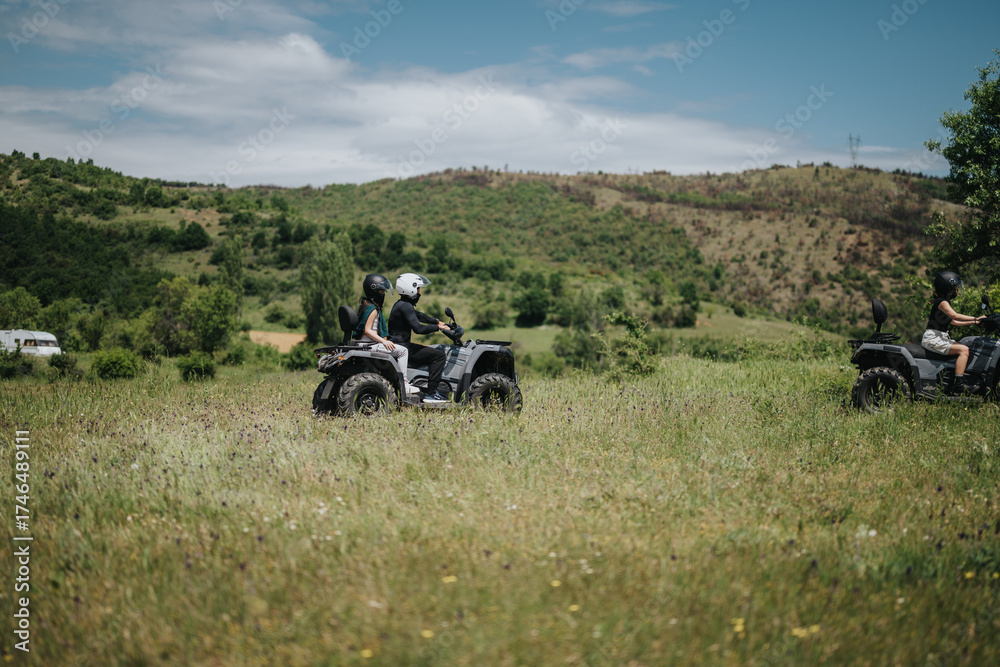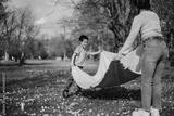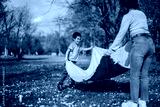 A joyful moment between a mother and her child, enjoying time outdoors laying a picnic blanket on a grassy field surrounded by blooming flowers.
